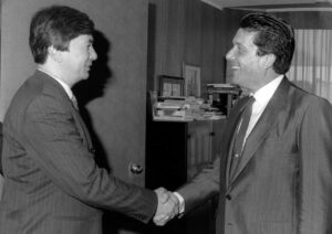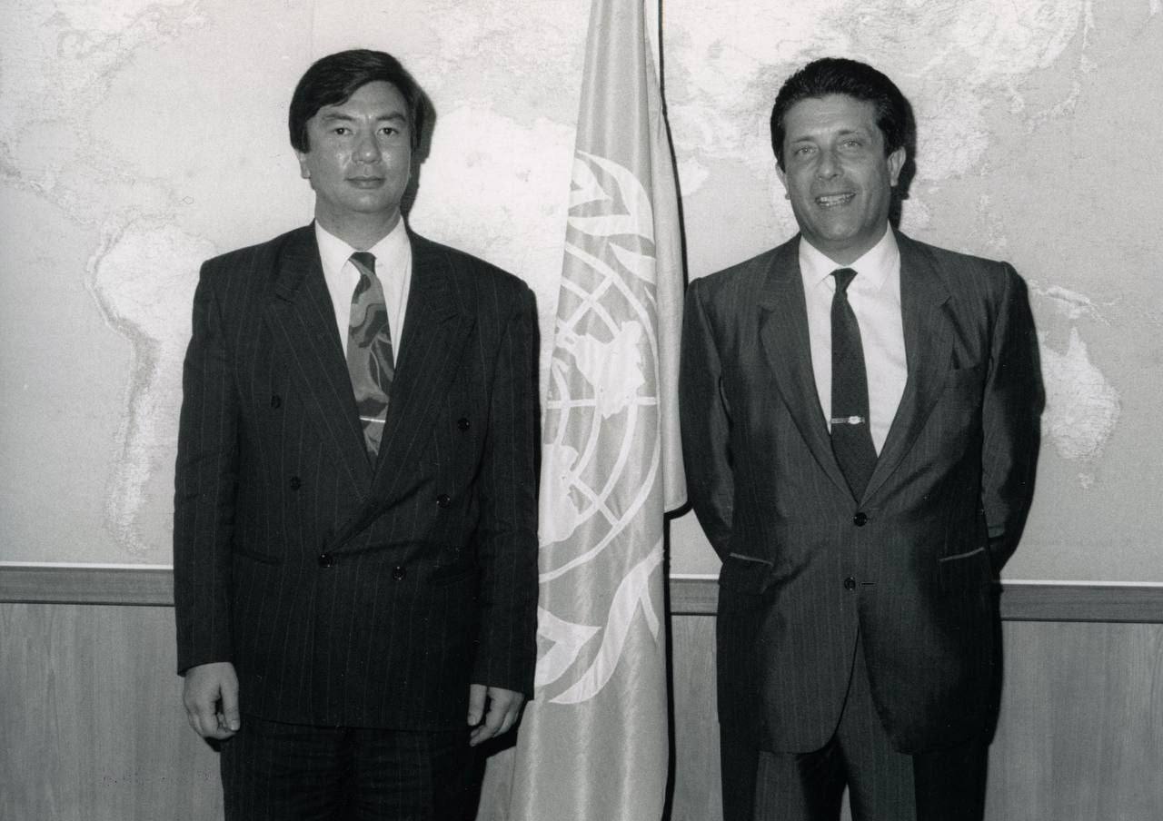 Совместное фото Касым-Жомарта Токаева и генерального директора ЮНЕСКО Федерико Майора после церемонии подписания акта о вступлении Казахстана в ЮНЕСКО 22 мая 1992 года.