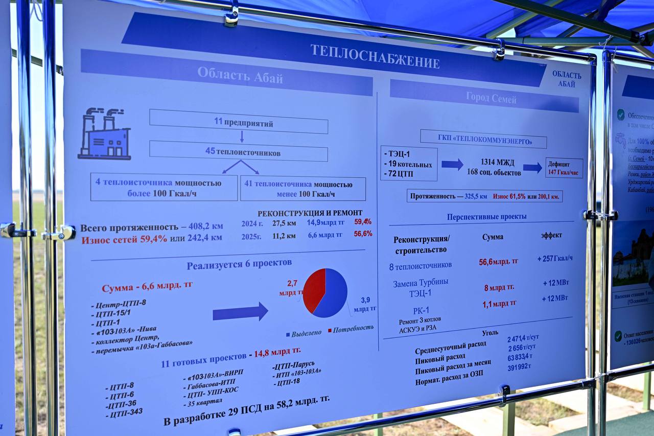 Как доложил руководитель областного управления энергетики, жилищно-коммунального хозяйства Жандос Каирханов, в области функционируют 11 тепловых предприятий, 45 источников тепла и 330 автономных тепловых котлов. Общая протяженность тепловых сетей – 408 километров, 59% которых изношены. В Семее подготовлено 11 проектов по увеличению мощностей тепловых котлов.