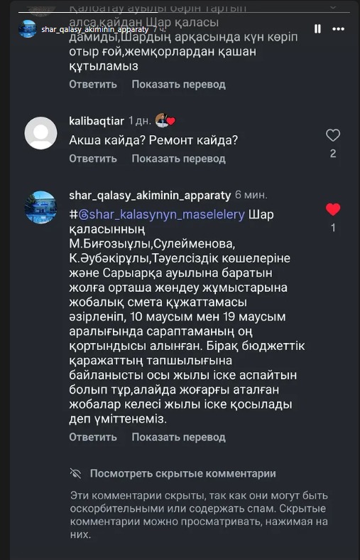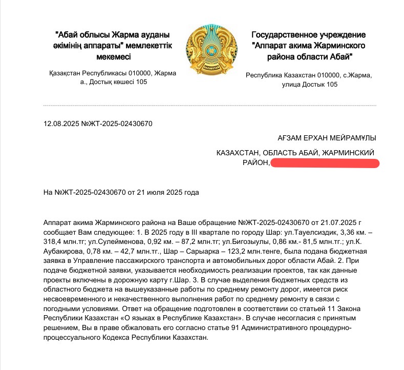 В официальном письме на обращение жителя сообщалось, что на те же улицы и дорогу Шар – Сарыарка подана бюджетная заявка с конкретными суммами. Отмечалось, что при условии выделения средств ремонт может быть проведён уже в III квартале 2025 года, однако существует риск переноса сроков из-за погодных условий.