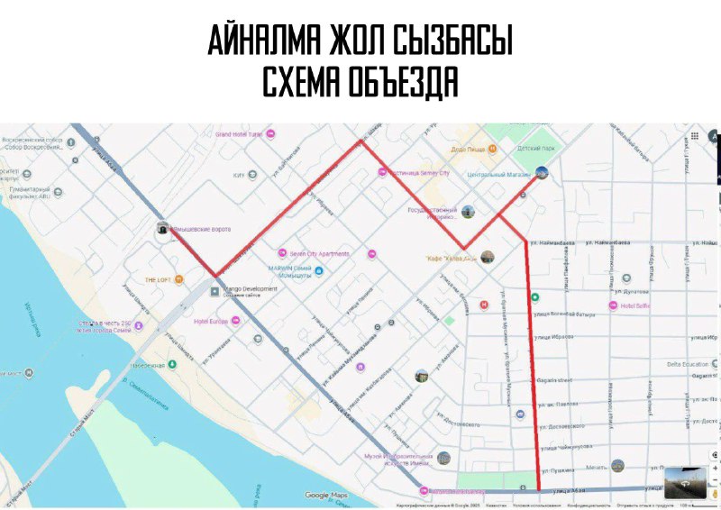 1.1. Схема объезда для маршрутов (направление от «Нового моста» в сторону ул. К.Мухамедханова) №№ 9, 28, 33, 36, 41, 56 с улицы Абая с левым поворотом на проспект Шакарима с правым поворотом на улицу Дулатова, далее с левым поворотом на улицу Мухамедханова, аналогично в обратном направлении.